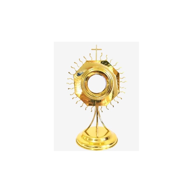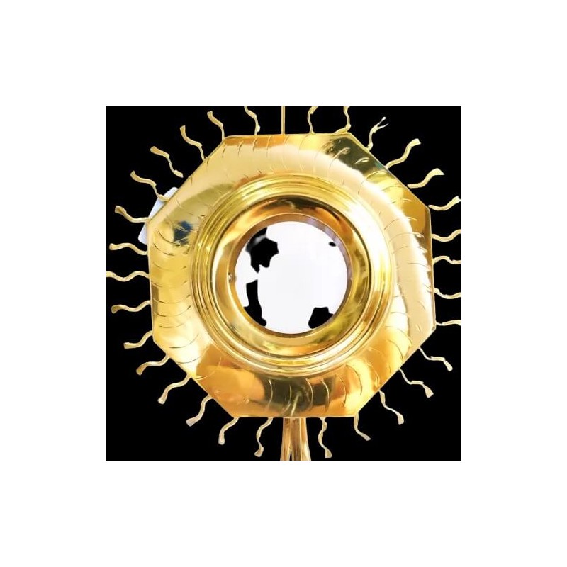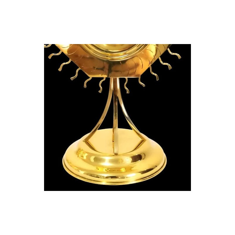 Ostensorio está hecho de bronce, dorado con detalles platados y con una piedra de rubio en la cruz de alta calidad.
