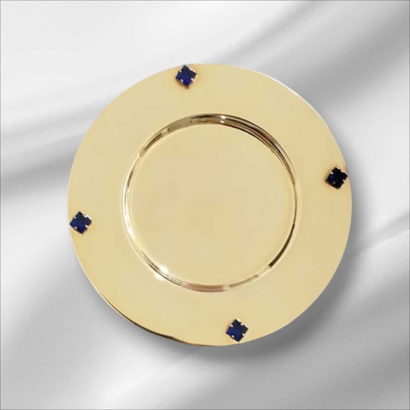 Esta patena dorada o niquelada, importada de altísima calidad tiene el papel fundamental en la preparación y presentación de los elementos sagrados de la Eucaristía.Se utiliza con respeto y cuidado para garantizar que las hostias sean tratadas de forma adecuada y respetada durante la celebración de la Misa.Este símbolo visible de la presencia de Cristo en la Eucaristía y de la comunión entre los fieles y Dios se encuentra aquí en nuestra tienda.Toma ahora y vea los otros modelos.