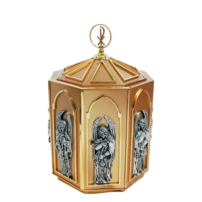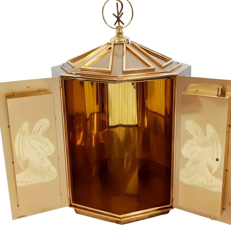 Este ciberdo dorado, importado de alta calidad, guarda la celebración del cuerpo y sangre de Cristo, que garantiza la reverencia y el cuidado adecuado a las hostias consagradas durante la comunión de los fieles.Este momento es la centralidad de la Eucaristía en la fe católica y en el respeto por la presencia de Cristo en la forma consagrada. Compra ahora en nuestra tienda y vea los otros modelos.