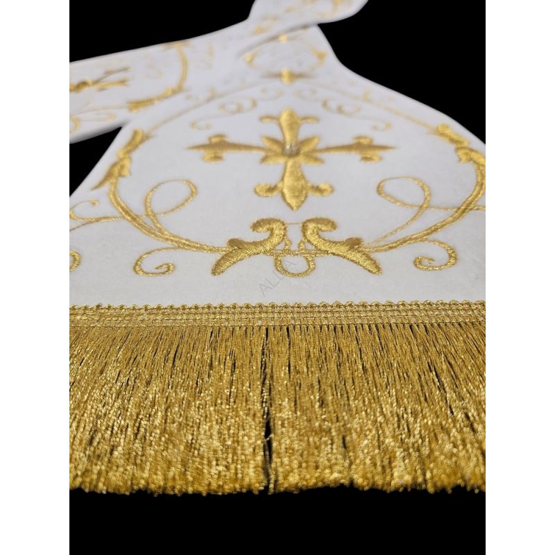 Estola romana bordada en alto relevo con línea dorada de alta calidad.