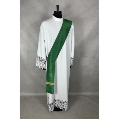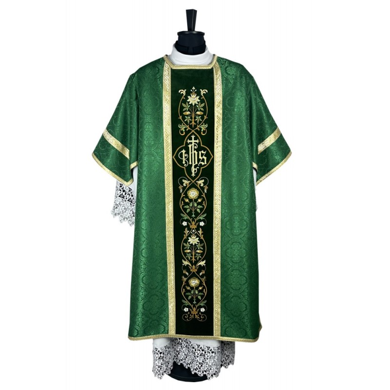 Dalmática bordada na frente e atrás sobre tecido de veludo. Tecido Adamascado. Feita sob medida.