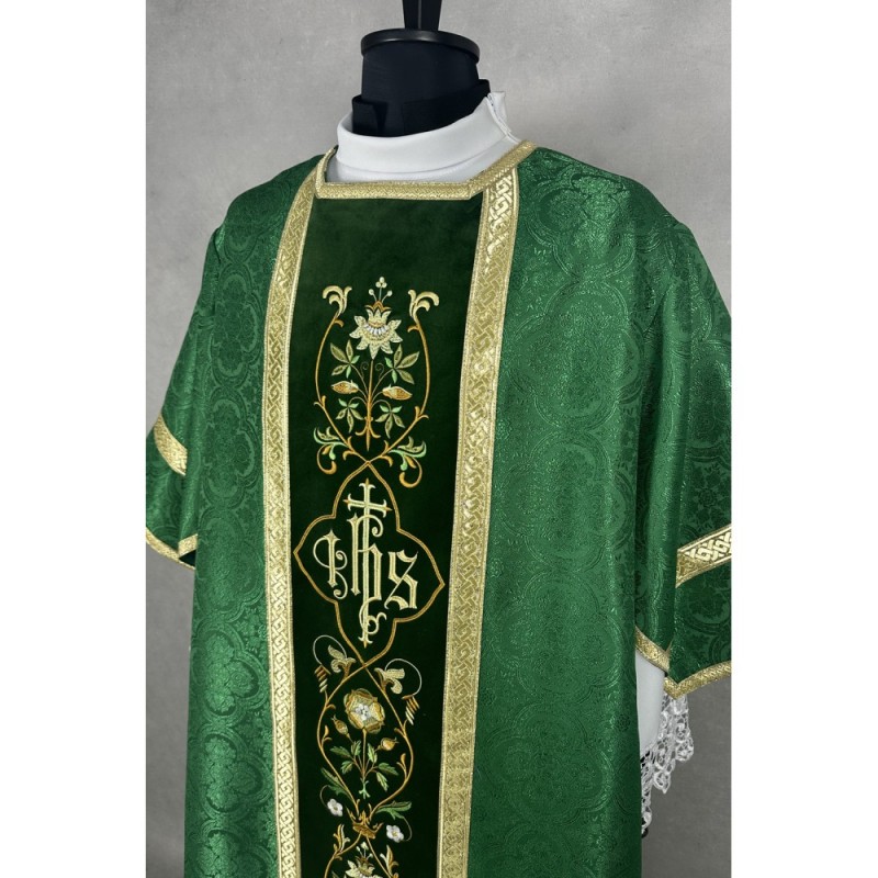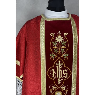 Dalmática bordada na frente e atrás sobre tecido de veludo. Tecido Adamascado. Feita sob medida.