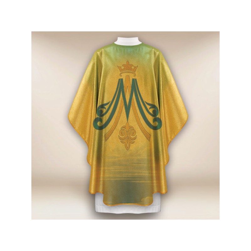 Casula gótica Mariana com tecnologia moderna de transferência de foto para o tecido na frente com a imagem de Nossa Senhora da Guadalupe.
