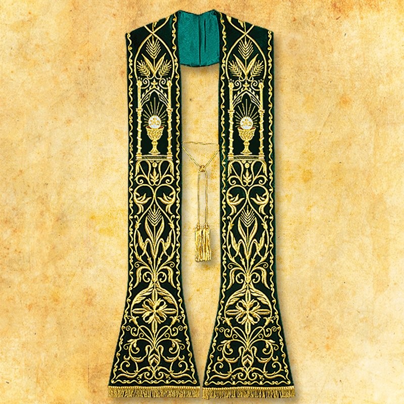 Estola romana bordada em alto relevo com linha dourada de altíssima qualidade.