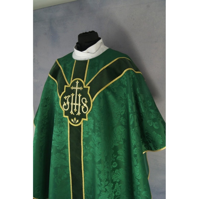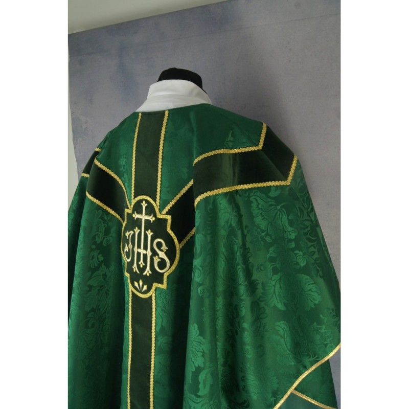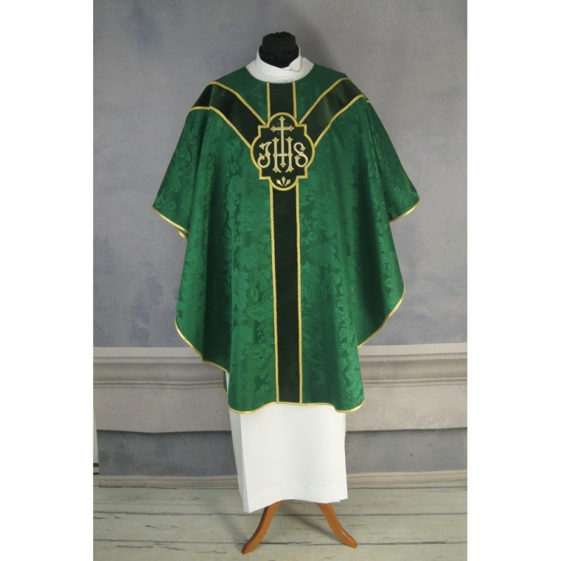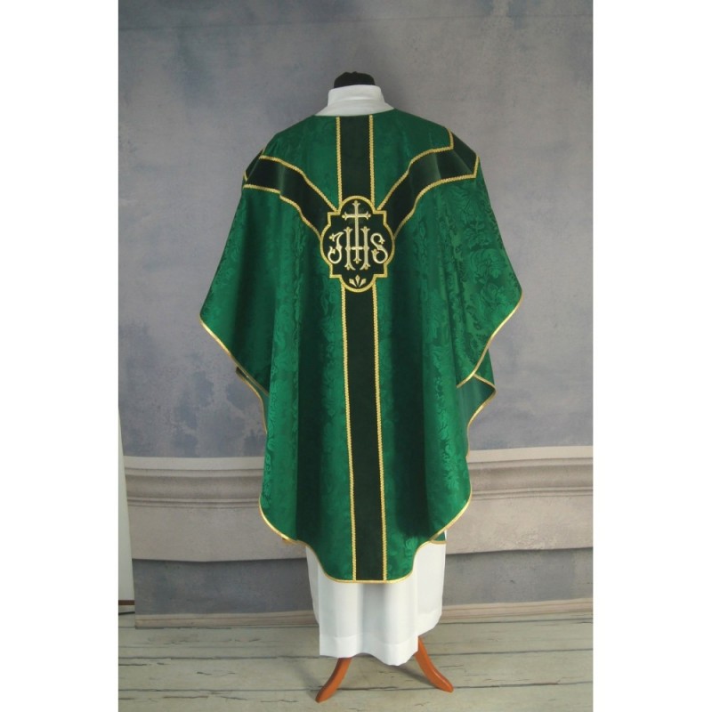Casula semigótica bordada em alto relevo com linha dourada.
