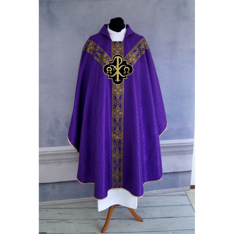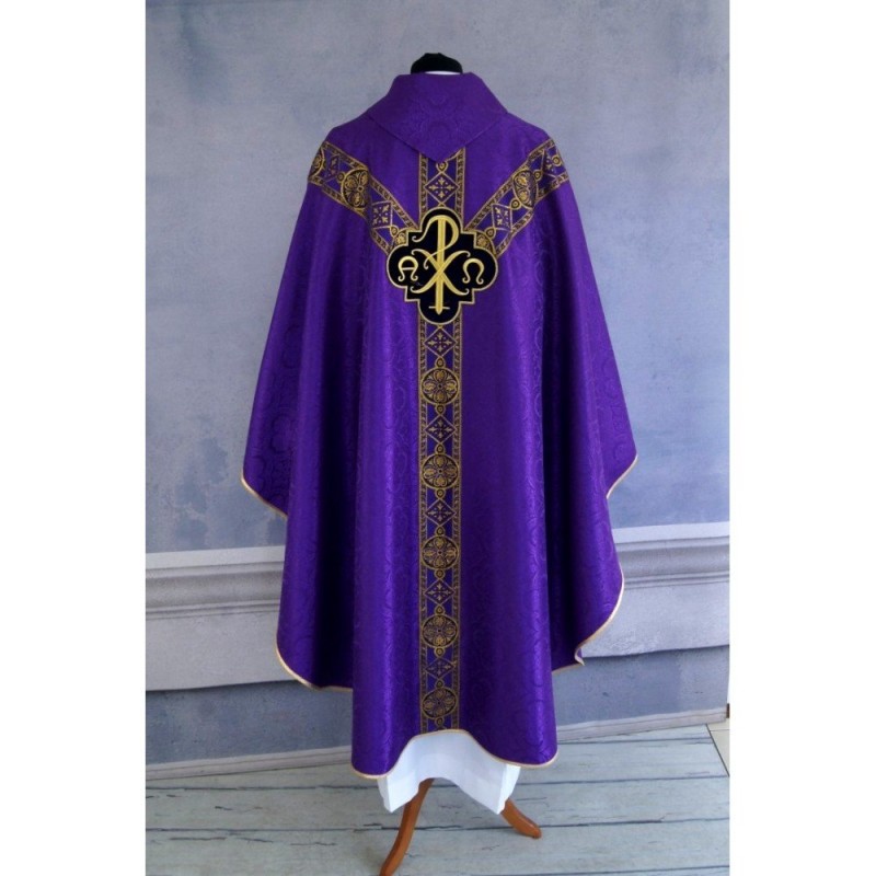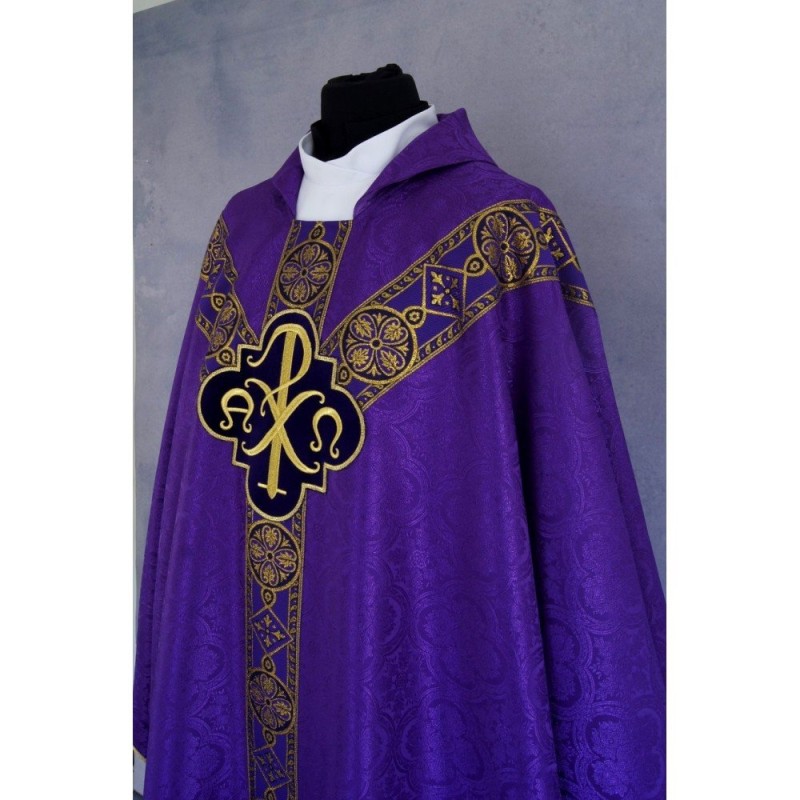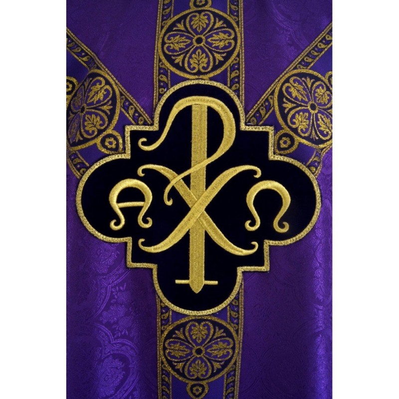 Casula semigótica bordada na frente e atrás com as letras PX sobre tecido de veludo.