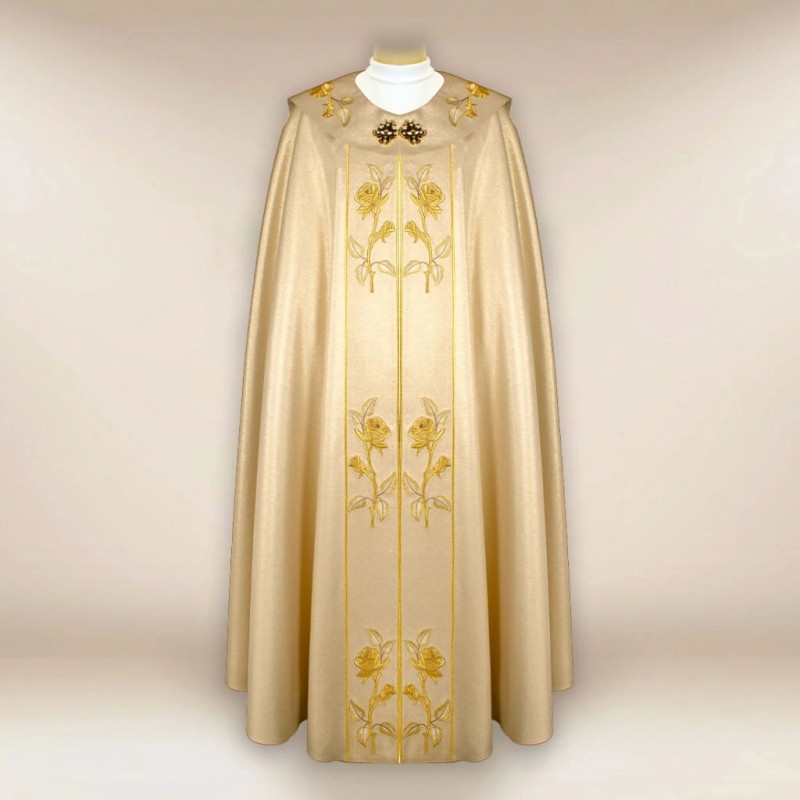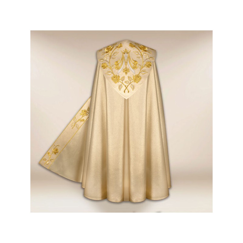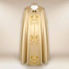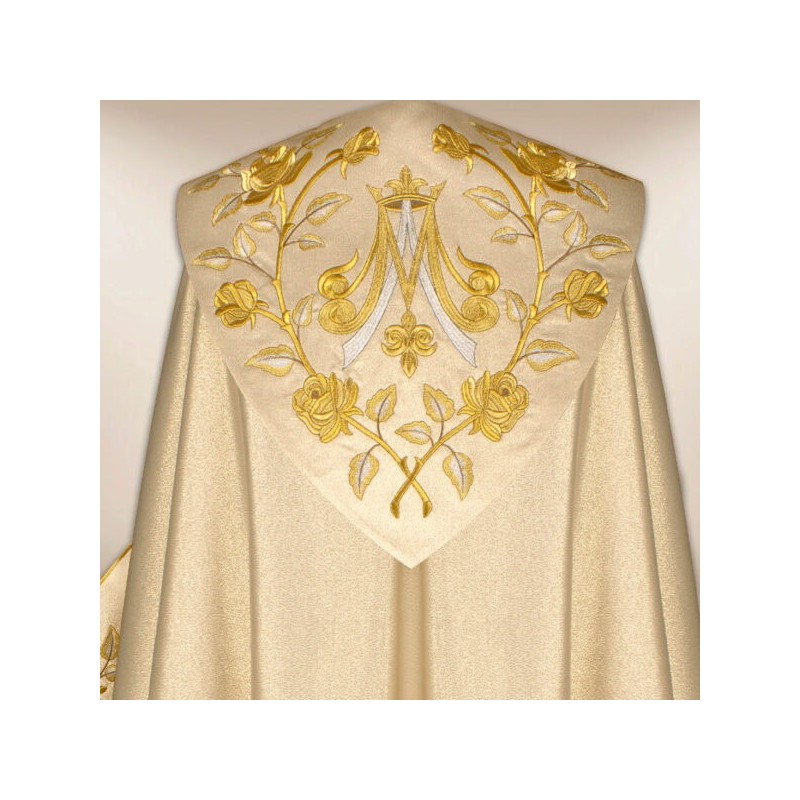 Casula gótica bordado no galão da frente e atrás em alto relevo com linha dourada de altíssima qualidade.