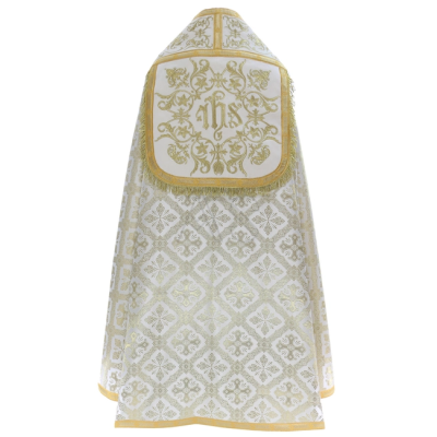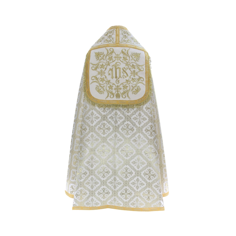 A casula semigótica é bordada em alto relevo com a imagem do Cordeiro de Deus e pedras de altíssima qualidade.
