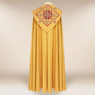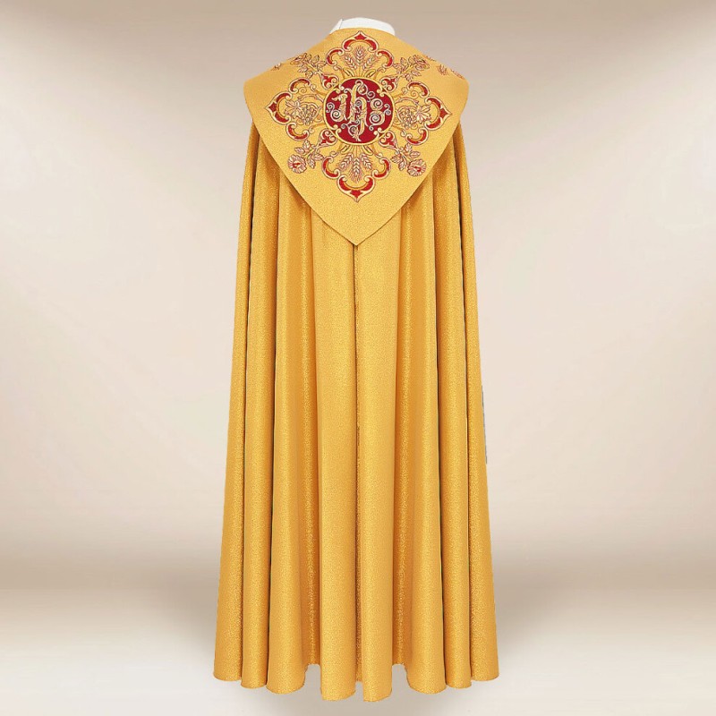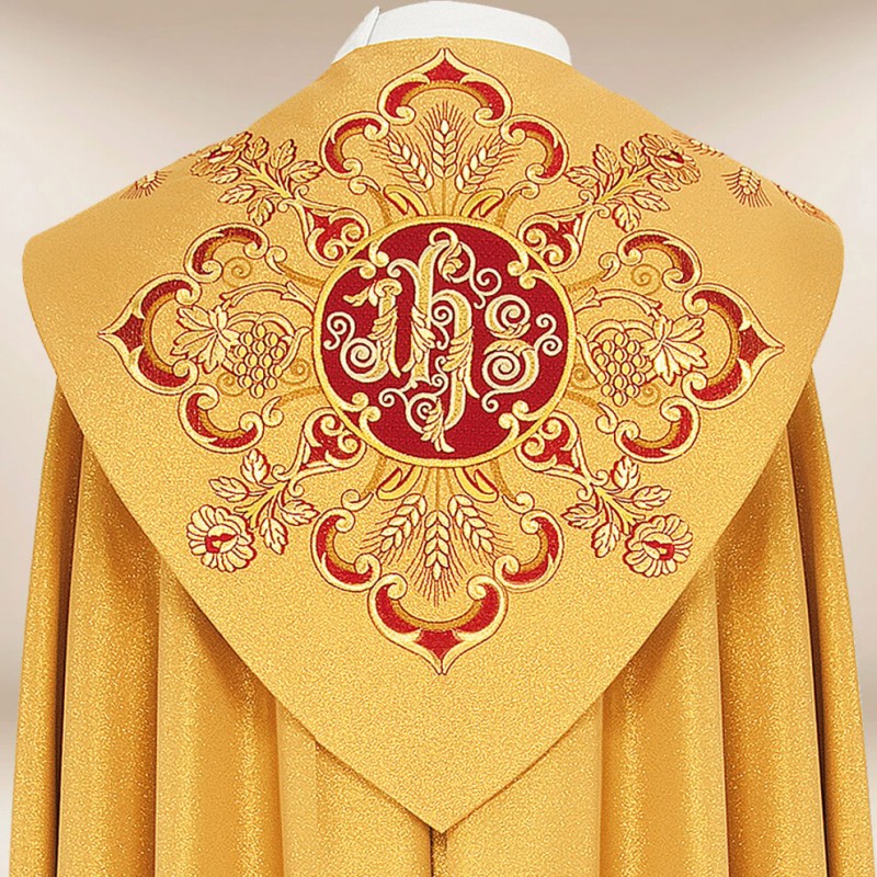 O bordado em alto relevo com linha dourada e com as letras JHS.