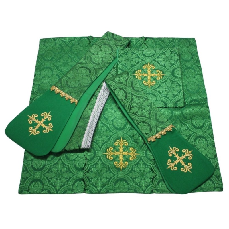 Acompanha uma estola, manípulo, véu de cálice e bolsa corporal.