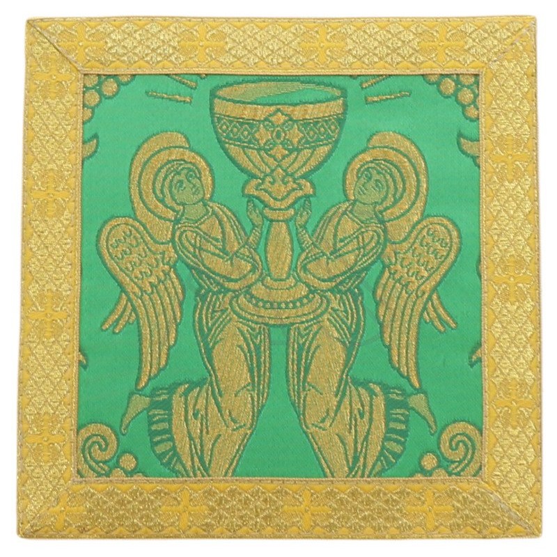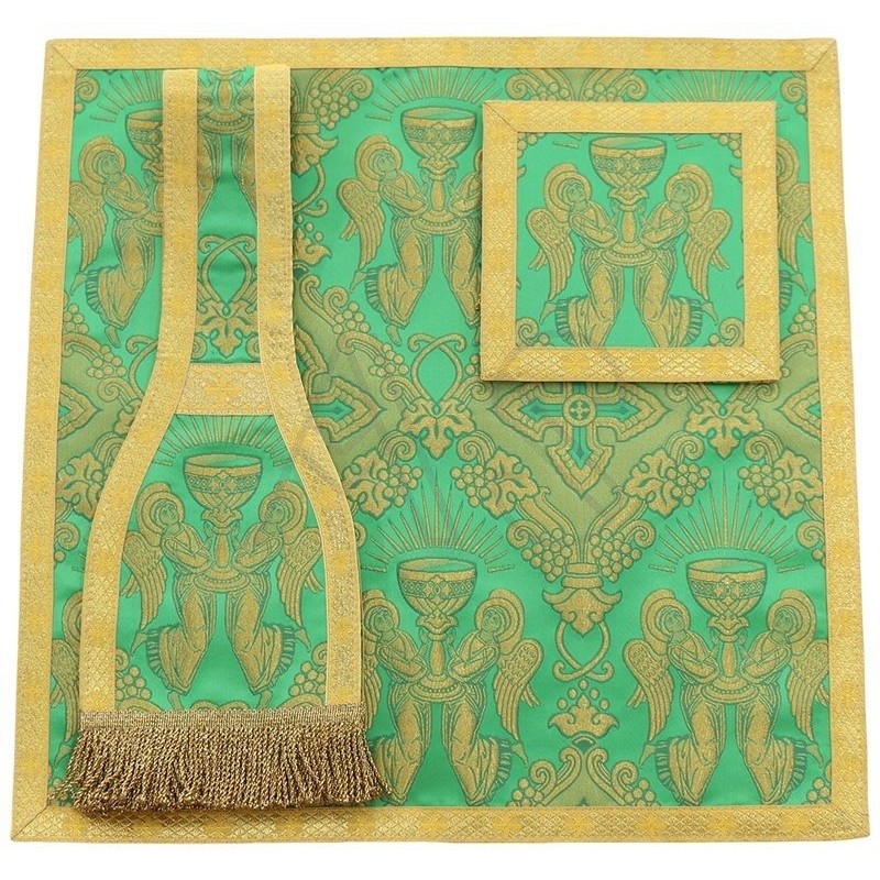 Acompanha uma estola, manípulo, bolsa corporal e véu de cálice.