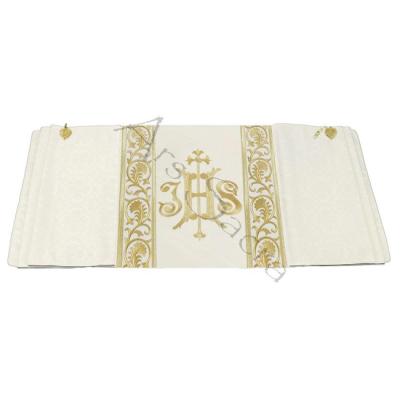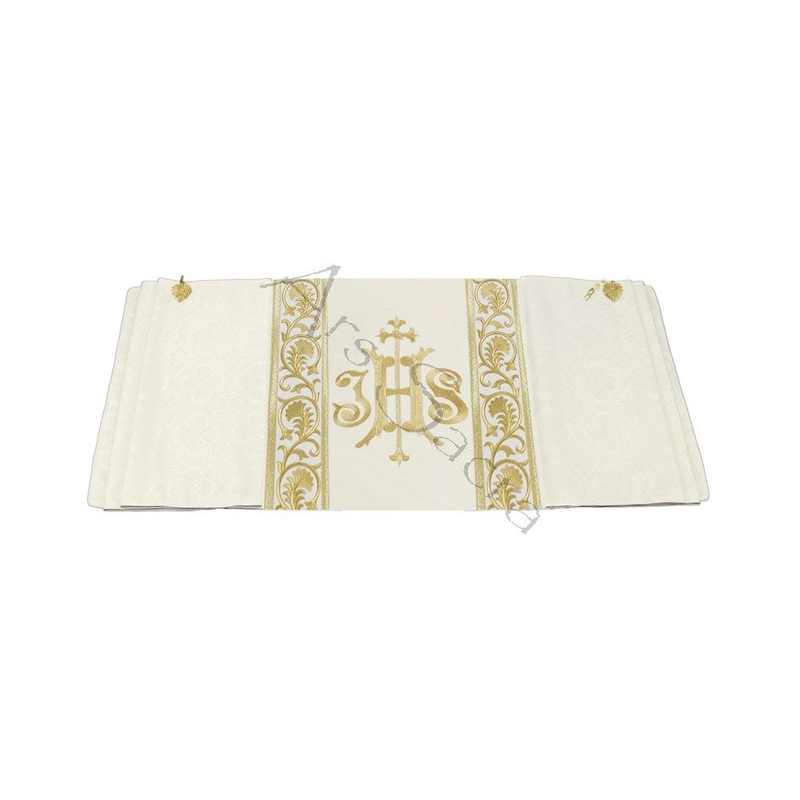 Véu umeral litúrgico bordado em alto relevo com linha dourada de altíssima qualidade.