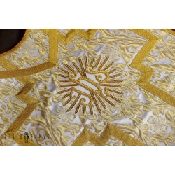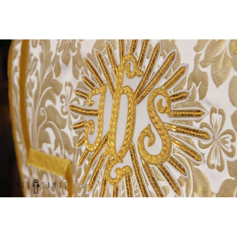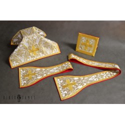 Acompanha uma estola, manípulo, bolsa corporal e véu de cálice.