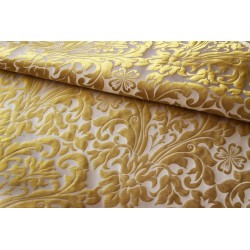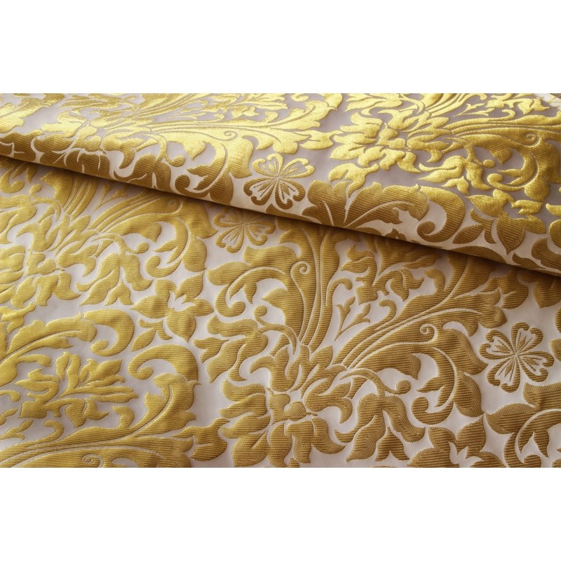 Tecido: Adamascado (viscose, poliéster e fios metalizados).