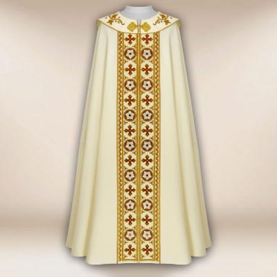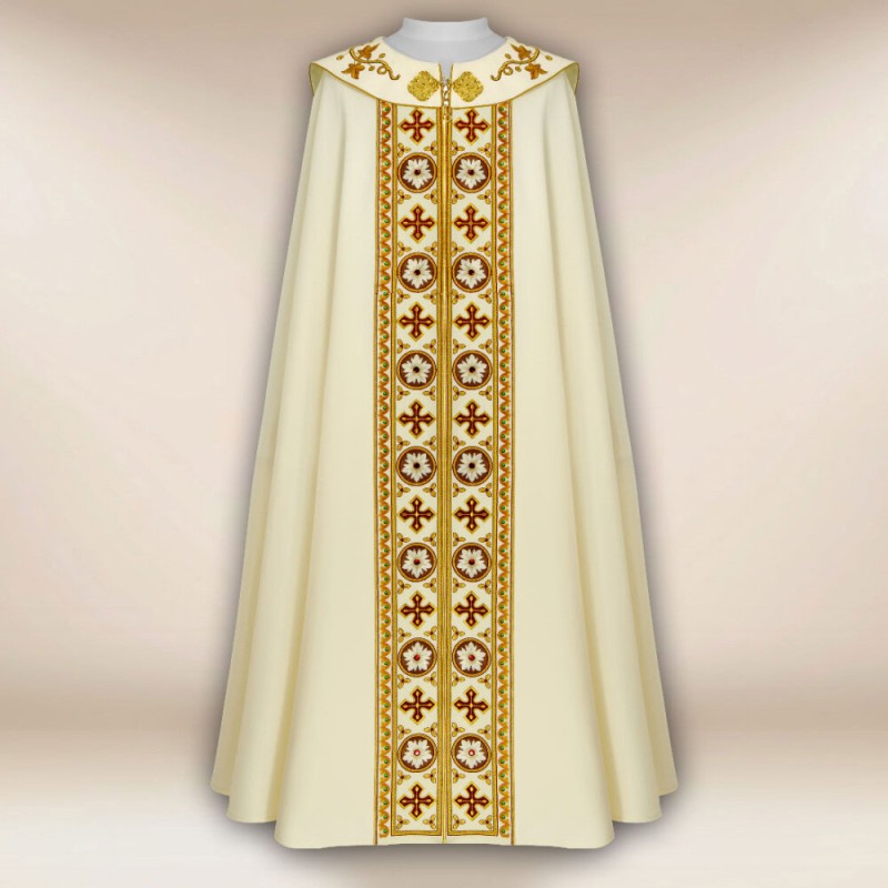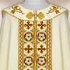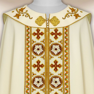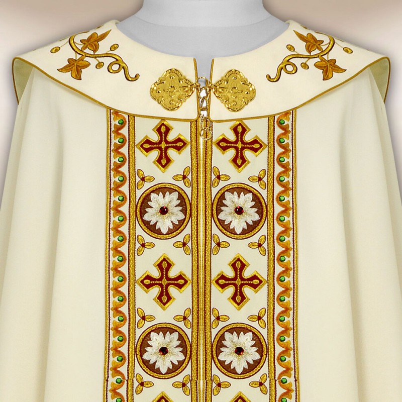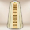 Casula romana bordada na frente e atrás em alto relevo com linha dourada.