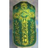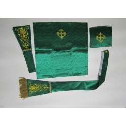Acompanha uma estola, manípulo, véu de cálice e bolsa corporal.