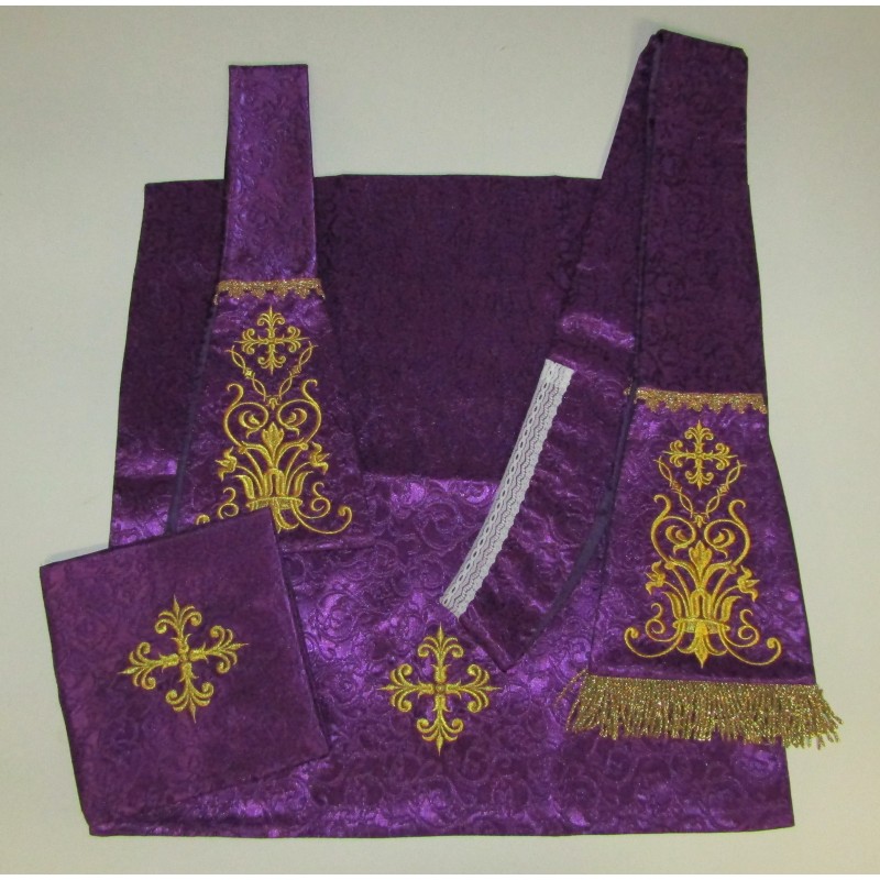 Acompanha uma estola, manípulo, véu de cálice e bolsa corporal.