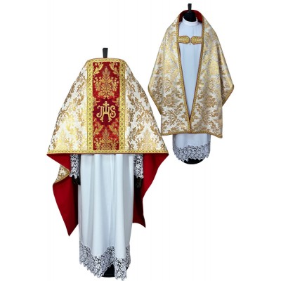 Casula semigótica no tecido Adamascado com bordado de altíssima qualidade. Acompanha manípulo, bolsa corporal e véu de cálice.