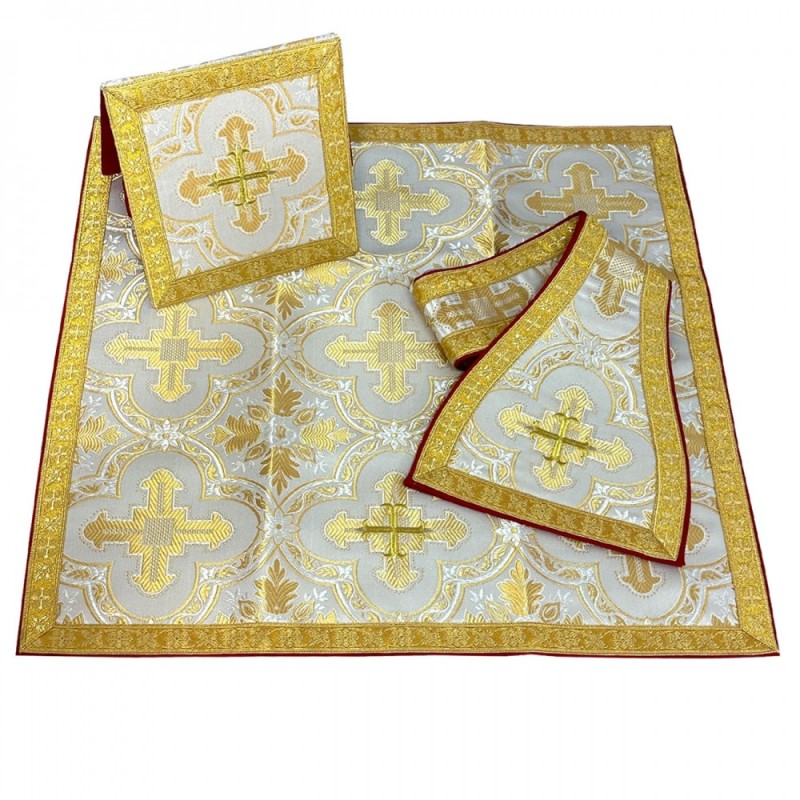 O conjunto inclui: bolsa corporal, manipulo e véu para cálice.