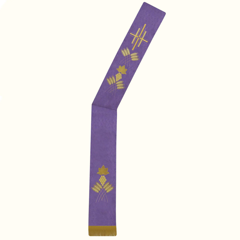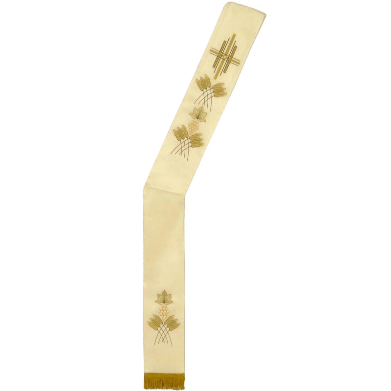 Véu umeral litúrgico bordado na parte de trás em alto relevo com fio dourado de altíssima qualidade.