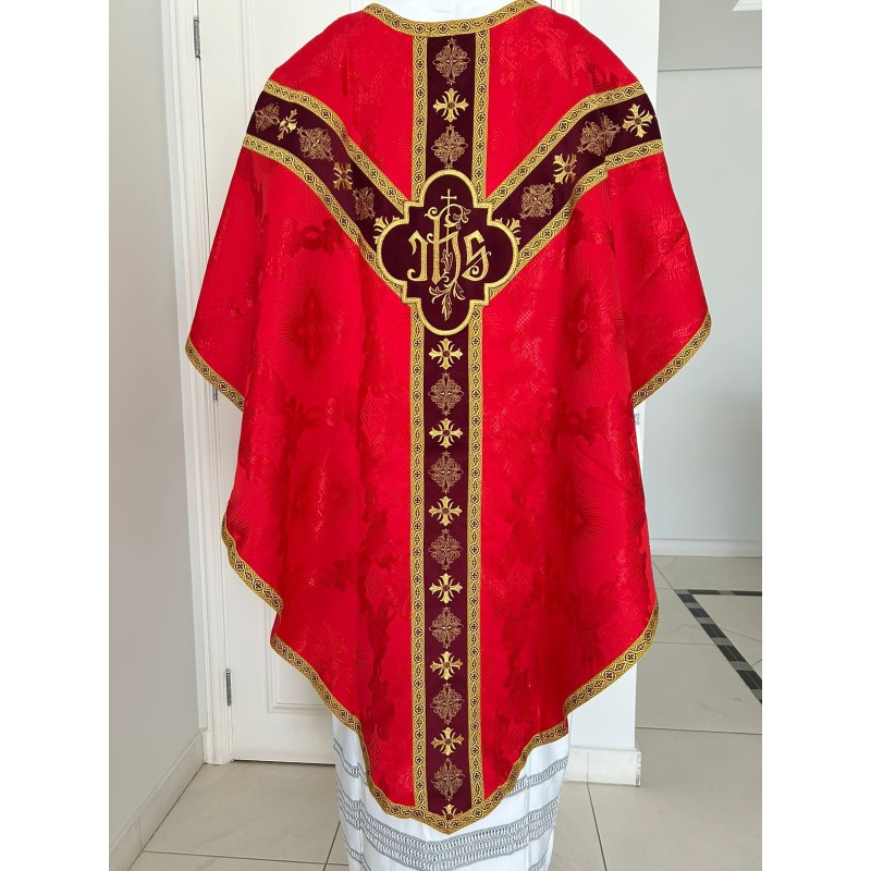 Casula semigótica bordada em alto relevo com listra de tecido em veludo.