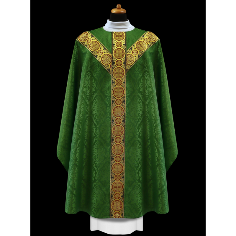 Casula semigótica feita no tecido Adamascado com fita dourada.