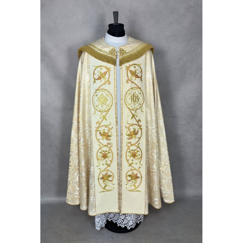 Casula semigótica bordada em alto relevo com listra de tecido em veludo.