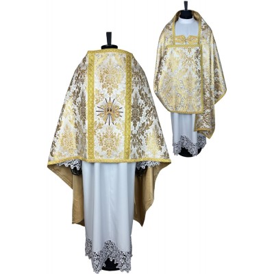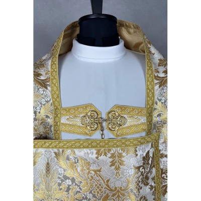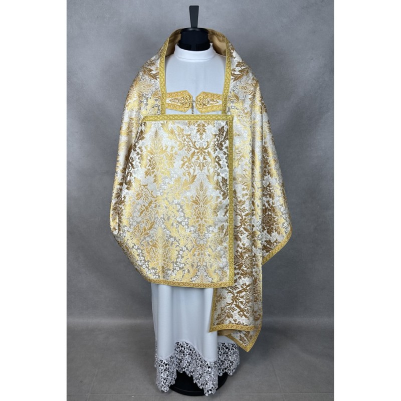 Casula romana bordada na frente e atrás em alto relevo com linha dourada.