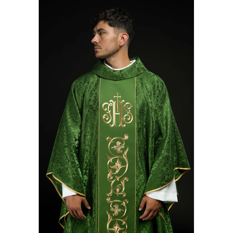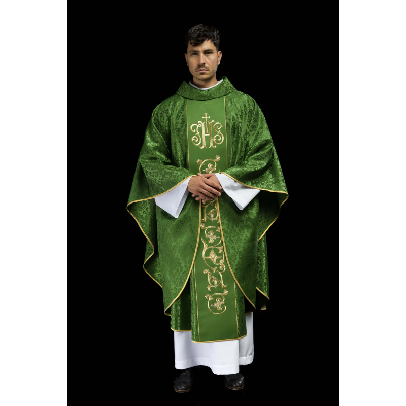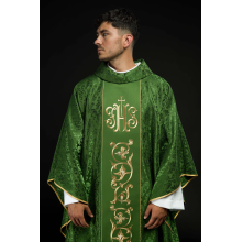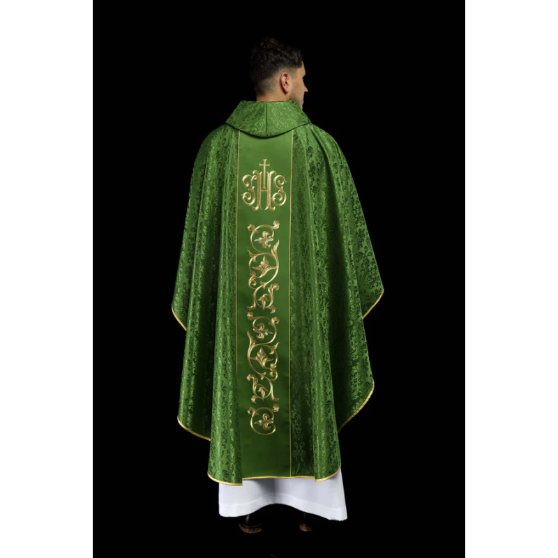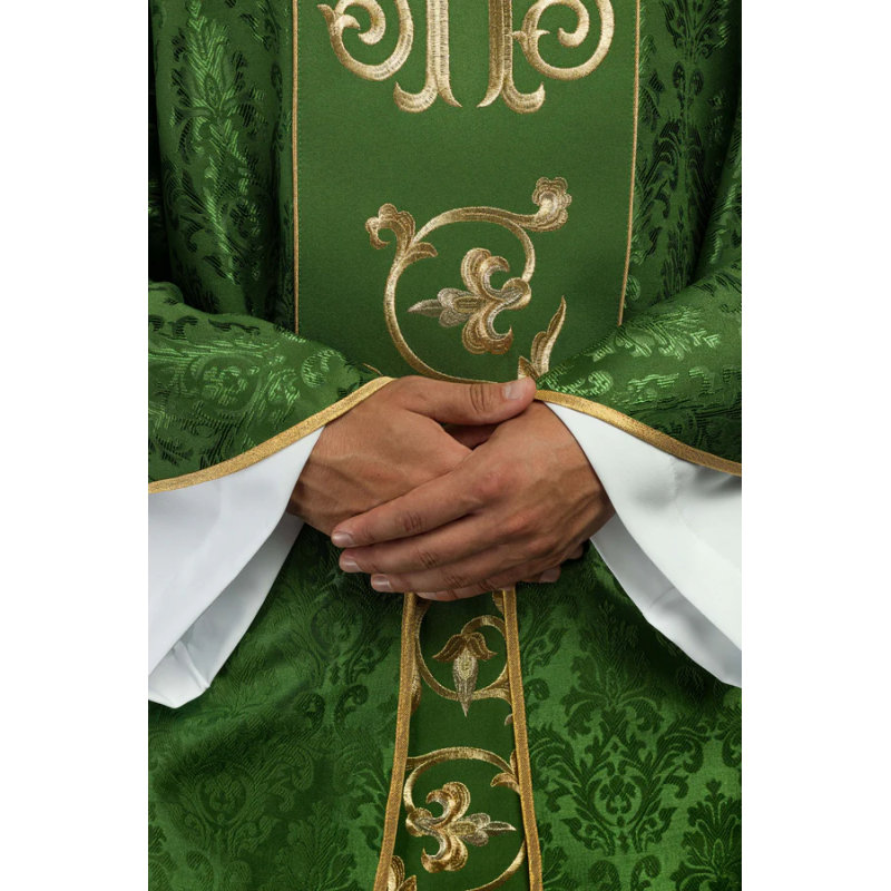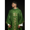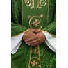 Casula gótica com bordado na frente e atrás. Acabamento com fios de cetim dourado.