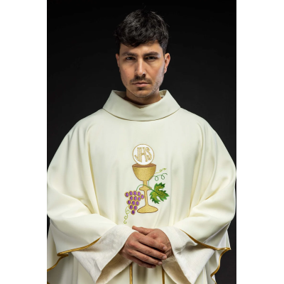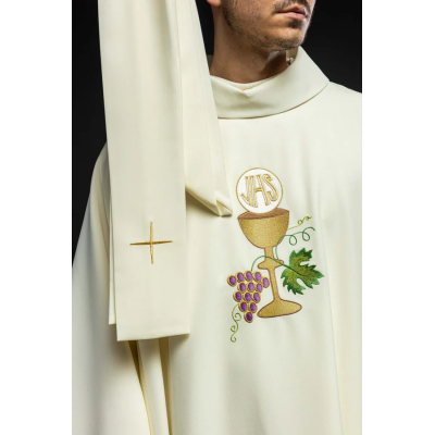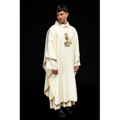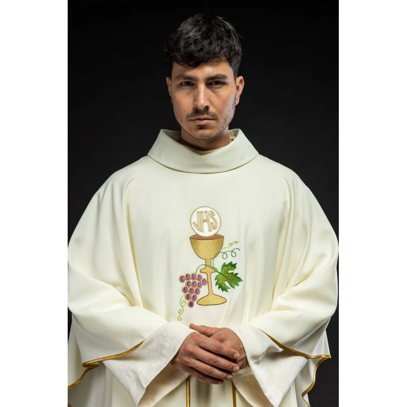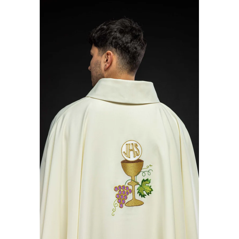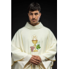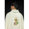 Casula gótica com bordado na frente e atrás. Acabamento em fios de cetim dourado.