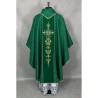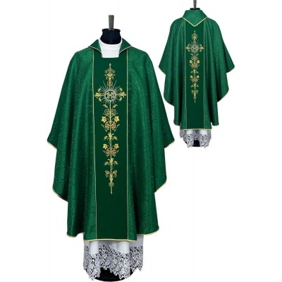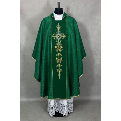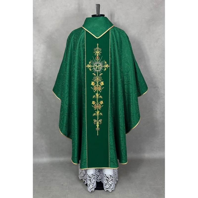 Casula gótica bordada na frente e atrás, acabamento com fios de cetim dourado.