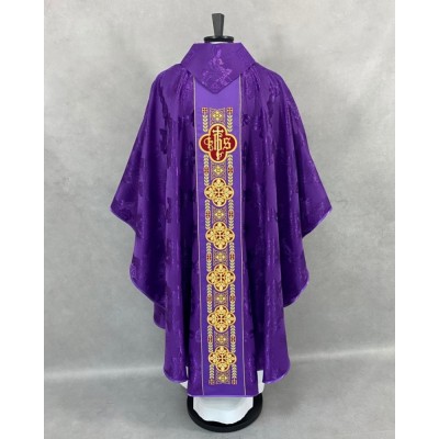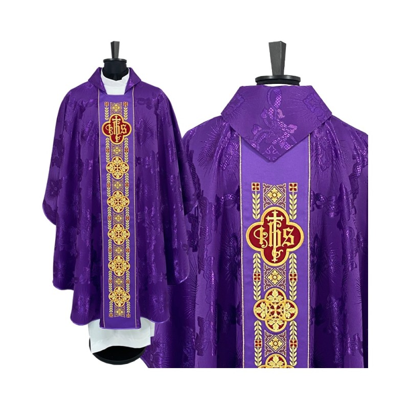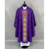 Casula gótica com bordado na frente e atrás e acabamento com fios metalizados.