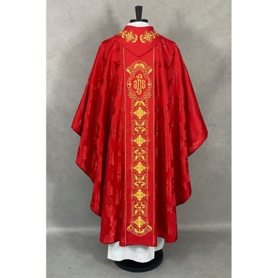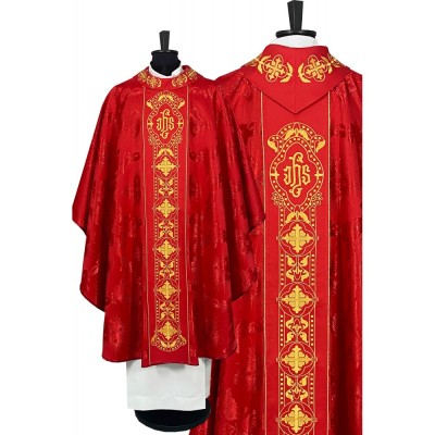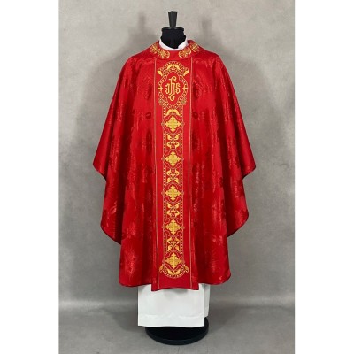 Casula gótica com bordado na frente e atrás e acabamento com fios metalizados.