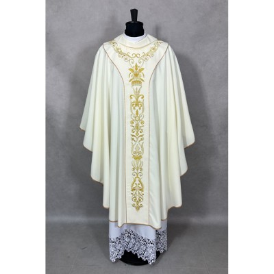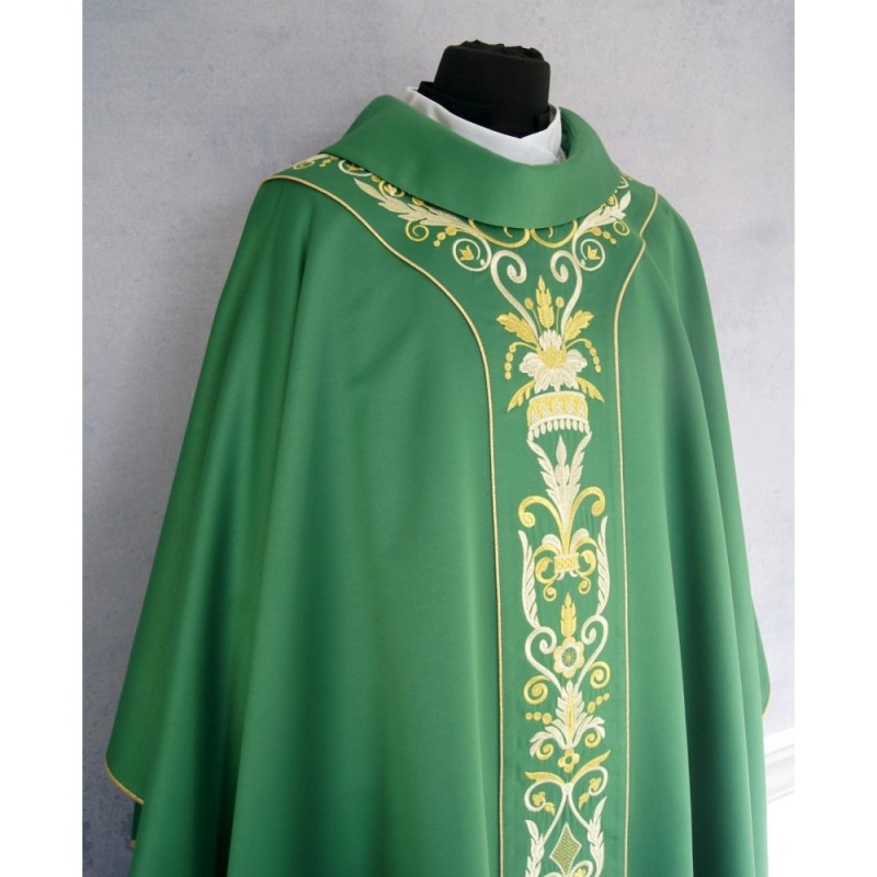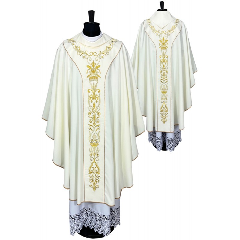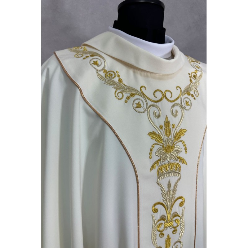 Casula semigótica com bordado na frente e atrás. Acabamento em fios de cetim dourado.