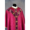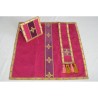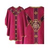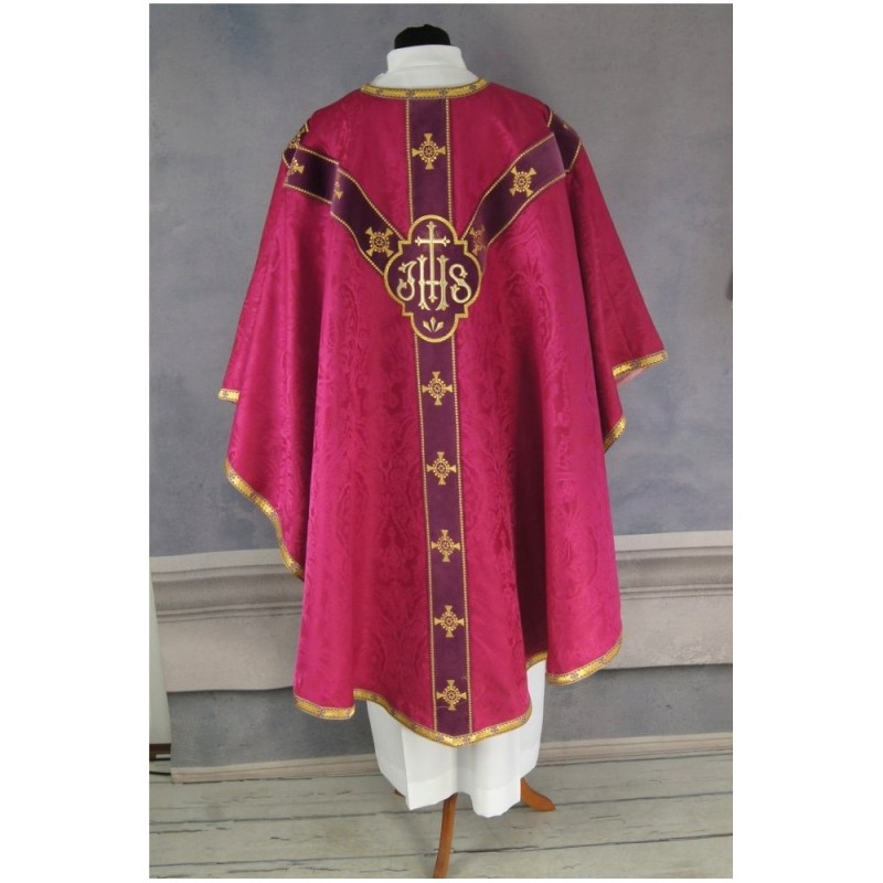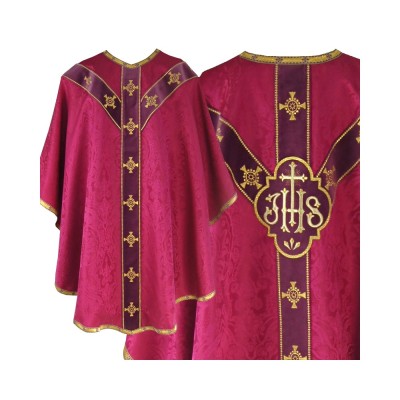 Casula semigótica bordada na frente e atrás com listra de tecido de veludo e fio metalizado de altíssima qualidade. Acompanha manípulo, bolsa corporal e véu de cálice.