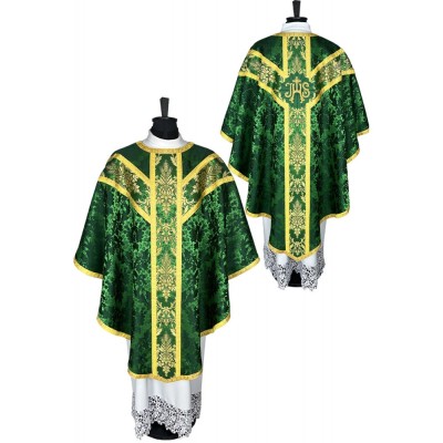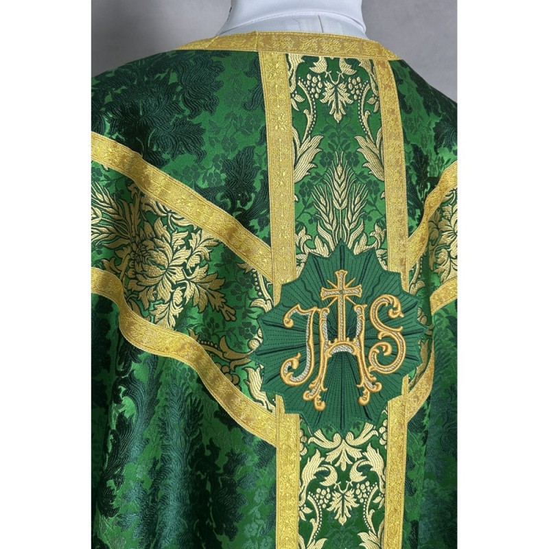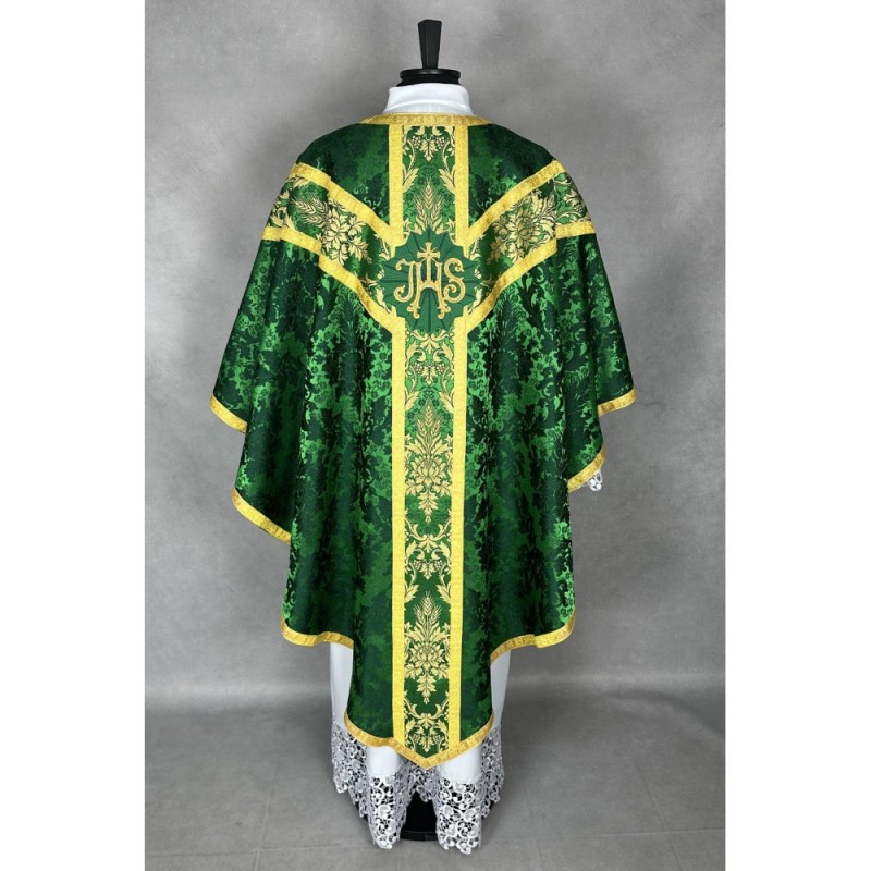 Casula semigótica com acabamento com fitas decorativas nas bordas. Acompanha manípulo, bolsa corporal e véu de cálice.