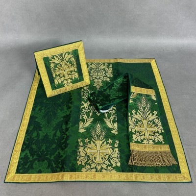 Acompanha uma estola, manípulo, bolsa corporal e véu de cálice.