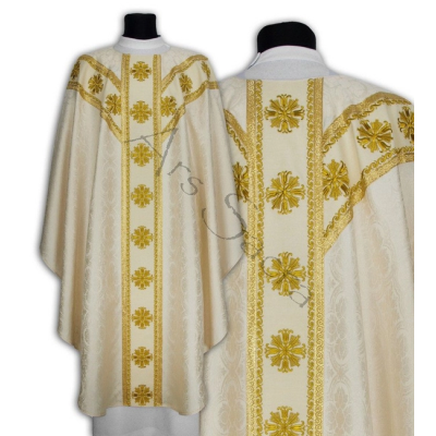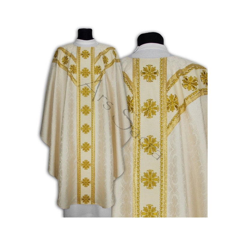 Casula semigótica bordada na frente e atrás em alto relevo com linha dourada de altíssima qualidade.