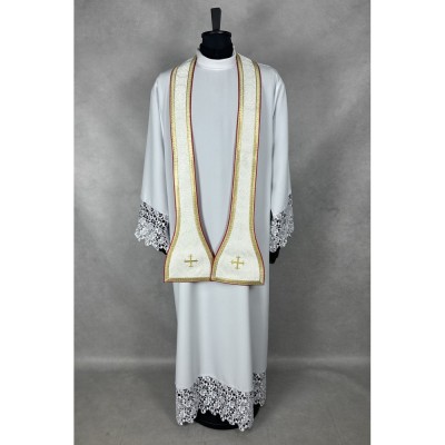 Sobrepeliz com pregas e bordada nas mangas e barra.