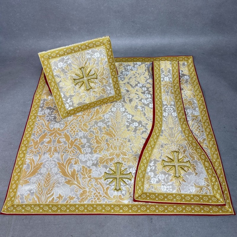 O conjunto inclui: bolsa corporal, manipulo e véu para cálice.