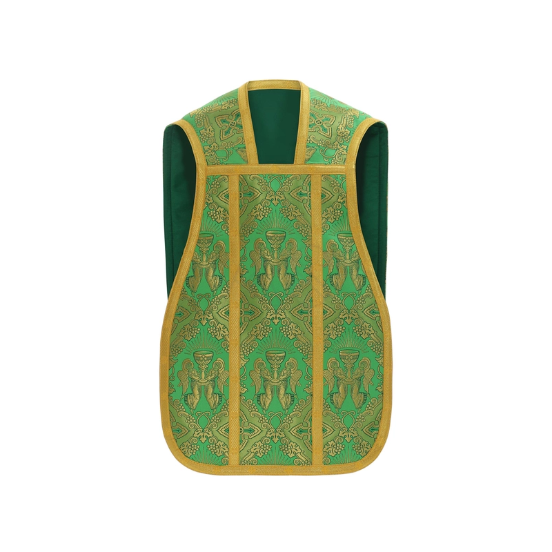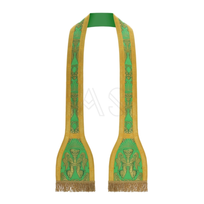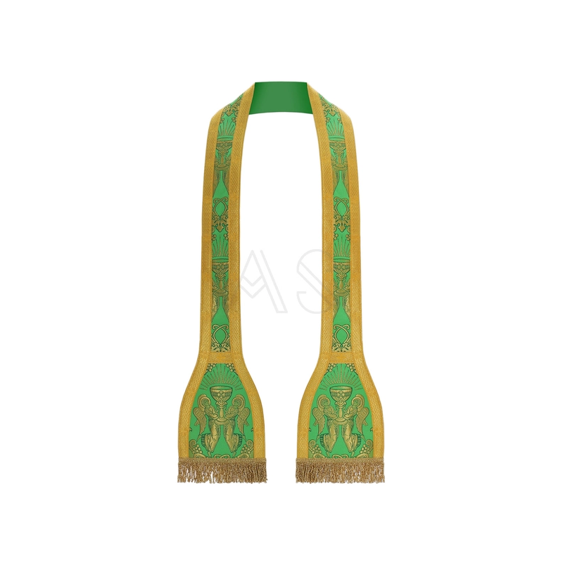 Acompanha uma estola, manípulo, bolsa corporal e véu de cálice.