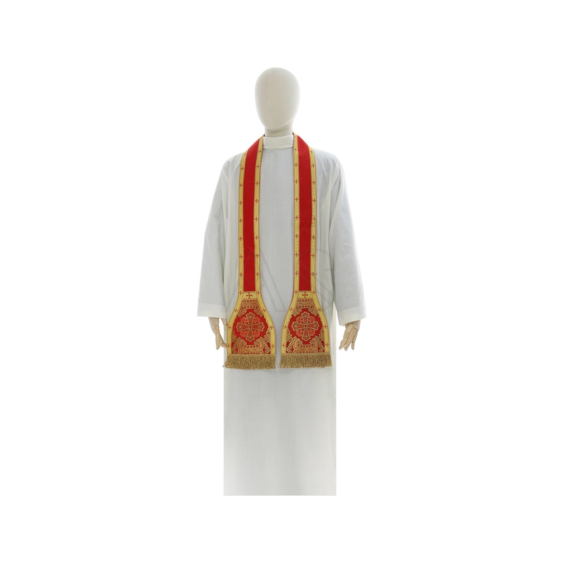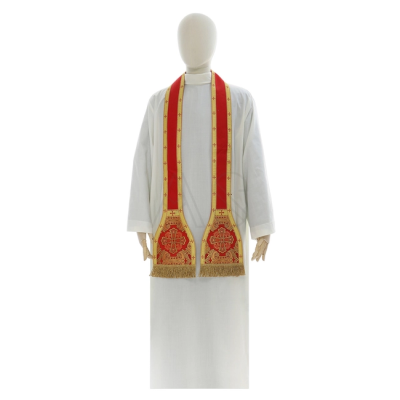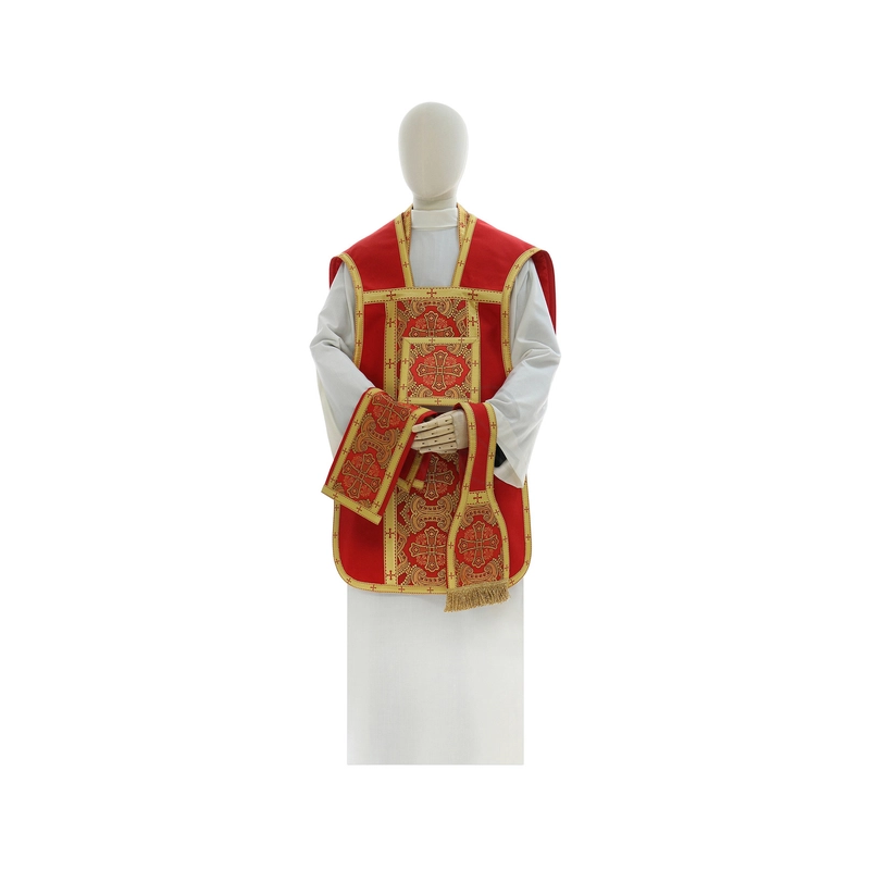 Acompanha uma estola, manípulo, bolsa corporal e véu de cálice.