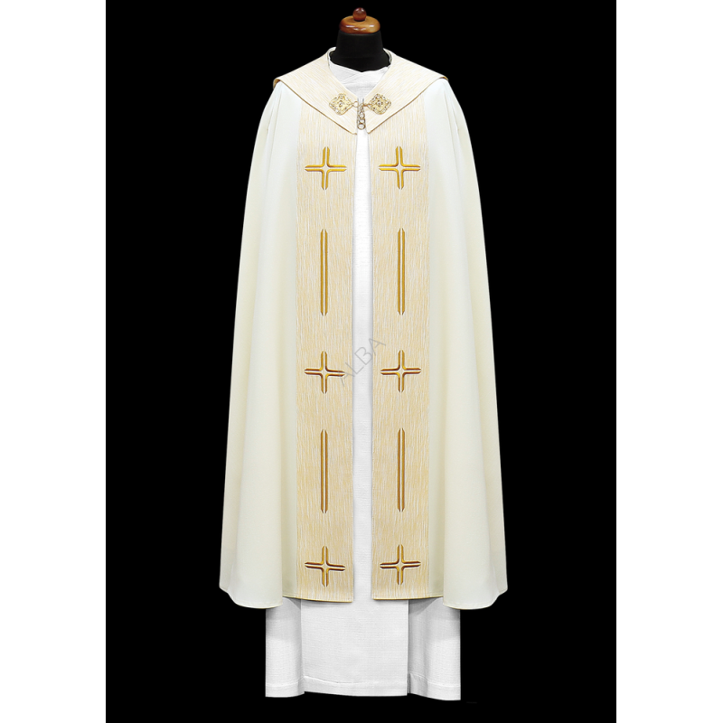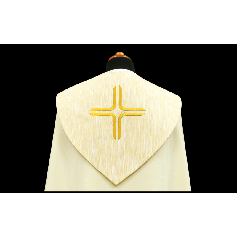 A casula semigótica é bordada em alto relevo com a imagem do Cordeiro de Deus e pedras de altíssima qualidade.