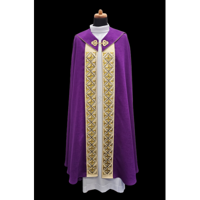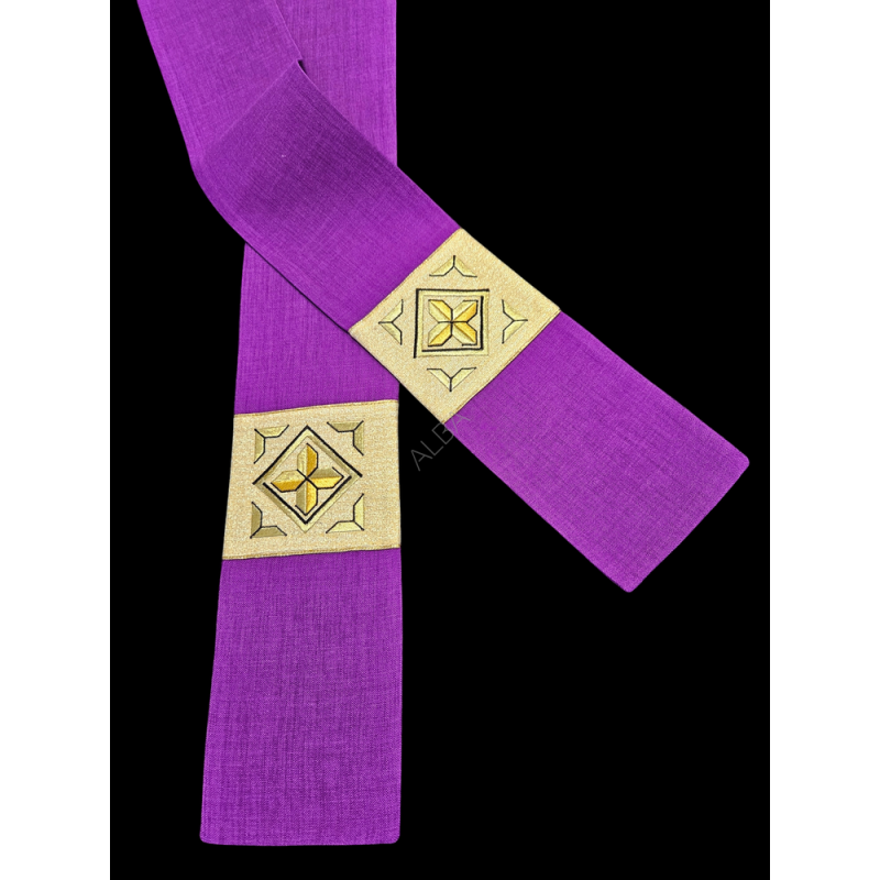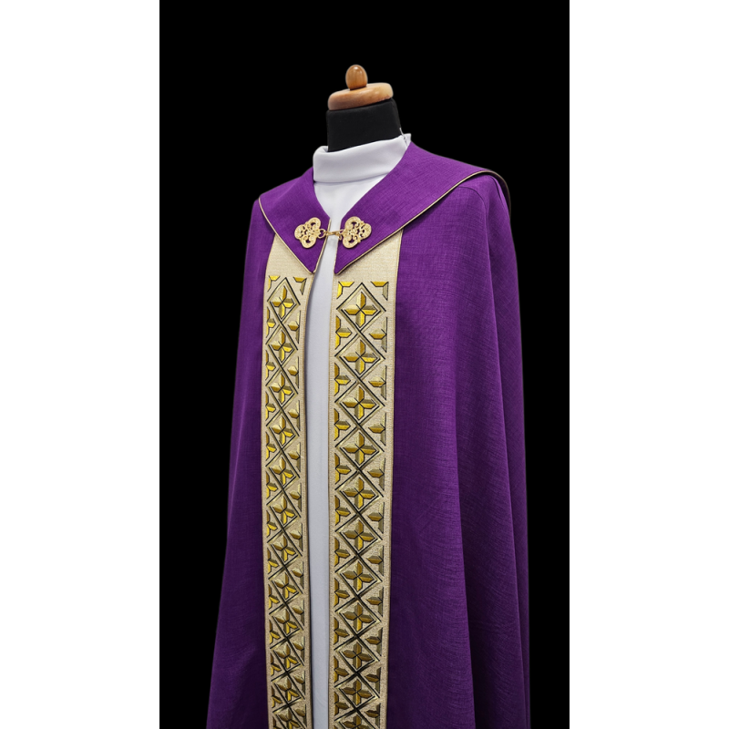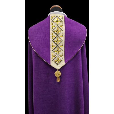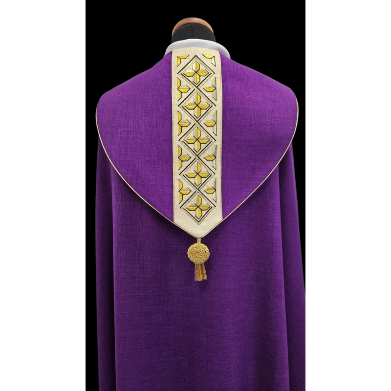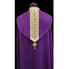 Casula semigótica bordada em alto relevo com listra de tecido em veludo.
