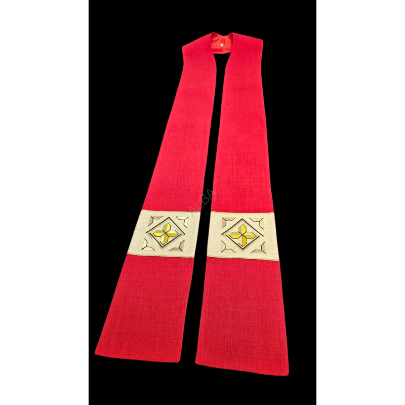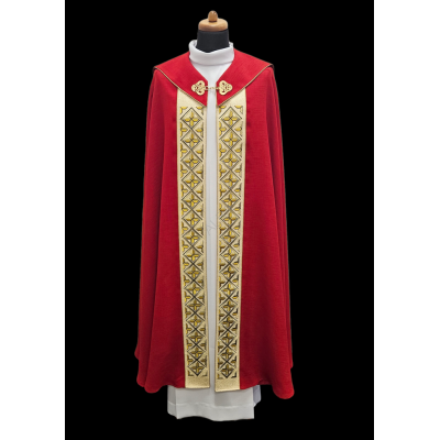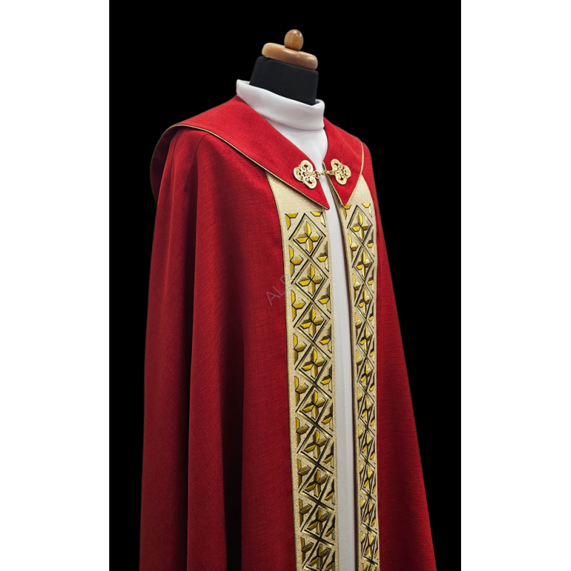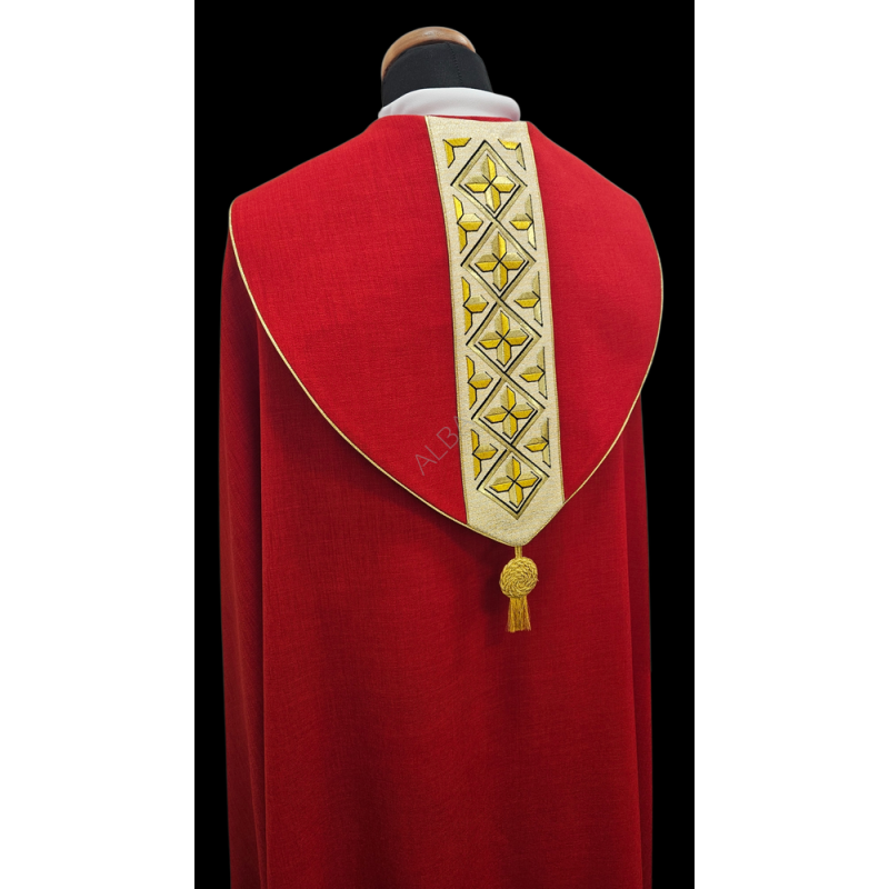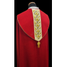 Casula semigótica bordada em alto relevo com listra de tecido em veludo.
