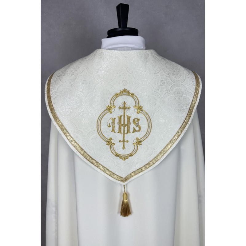 Túnica com pregas bordada com as letras JHS sobre a renda de altíssima qualidade.