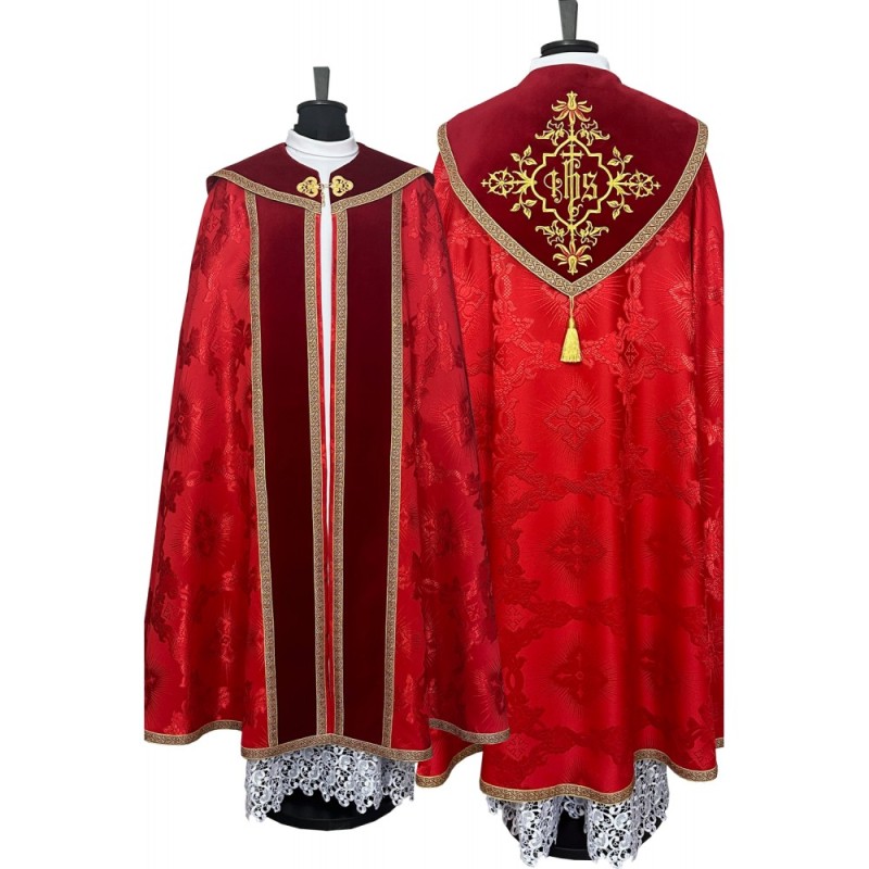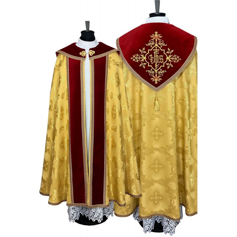 Casula romana bordada na frente e atrás em alto relevo com linha dourada.