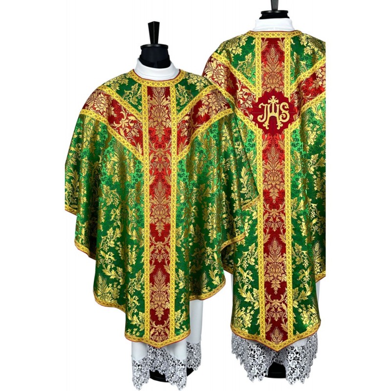 Casula semigótica com acabamento com fitas decorativas nas bordas. Acompanha estola.