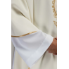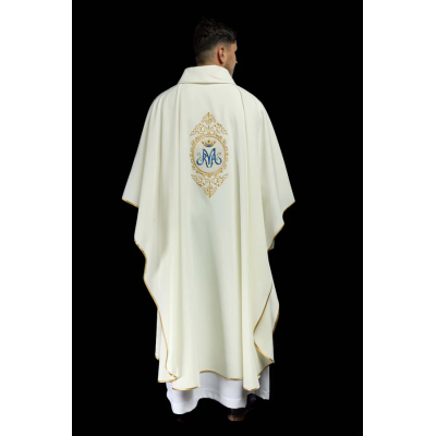 Casula gótica Mariana bordada na frente e atrás em alto relevo com fios dourados.