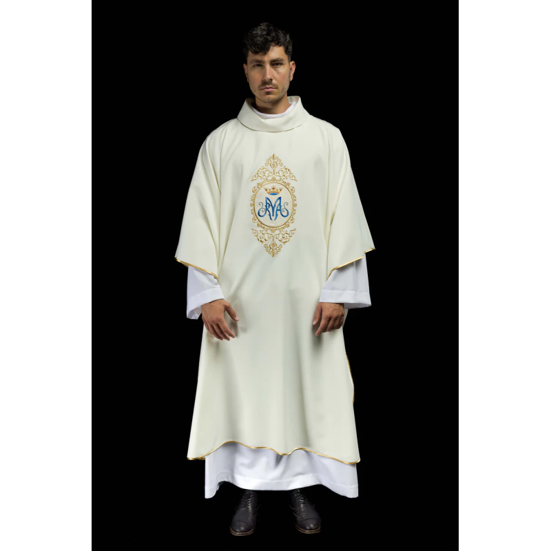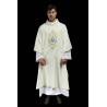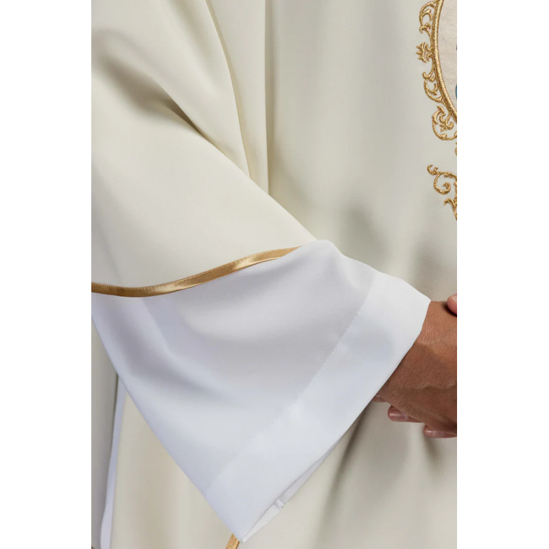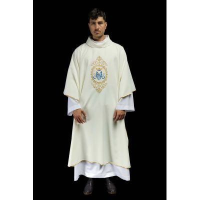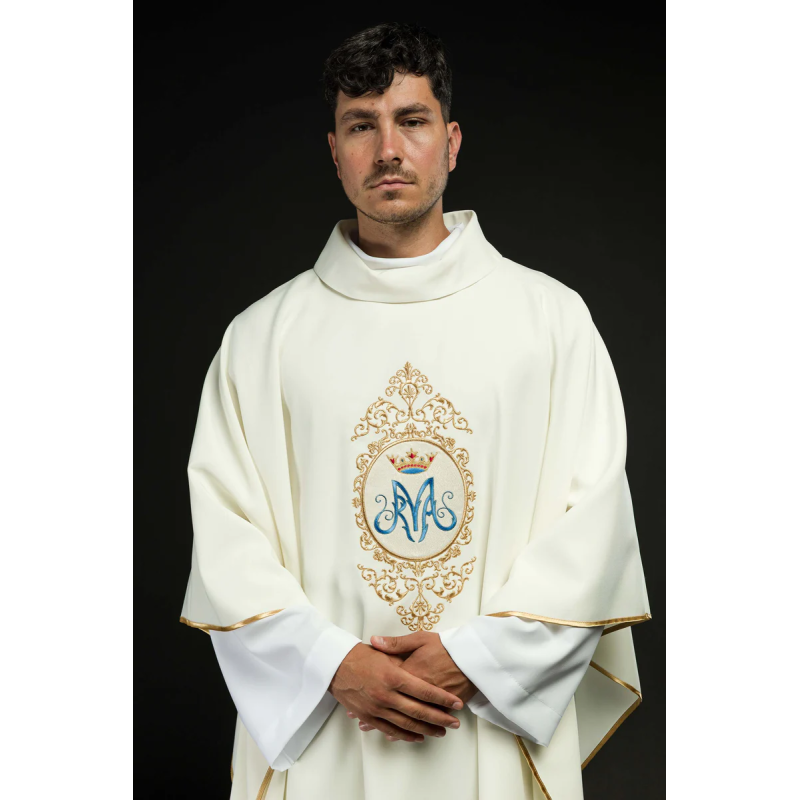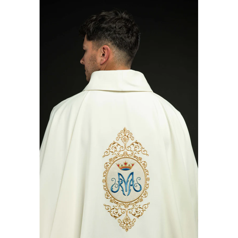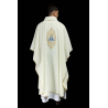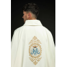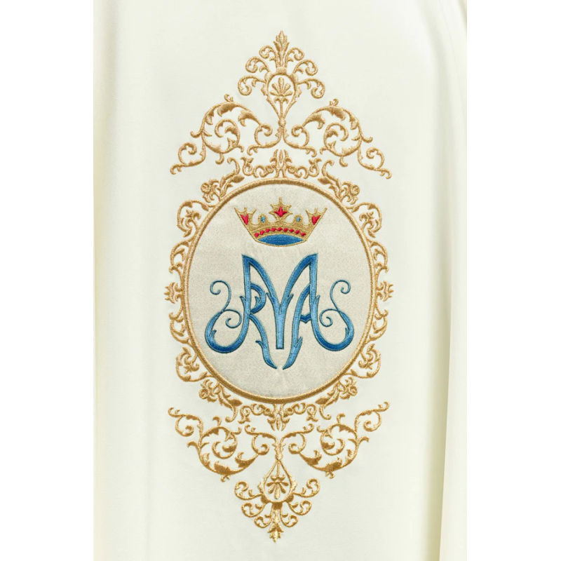 Casula gótica Mariana bordada na frente e atrás em alto relevo com fio dourado de altíssima qualidade.